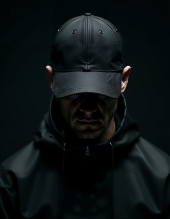 Dimly lit and centered, a figure wears a sleek black cap and hooded jacket, face obscured by shadows. the high-contrast lighting enhances the mood of mystery, ideal for themes of anonymity, stealth, or intrigue.