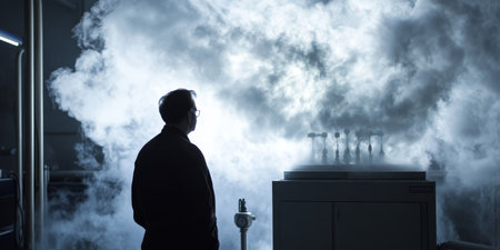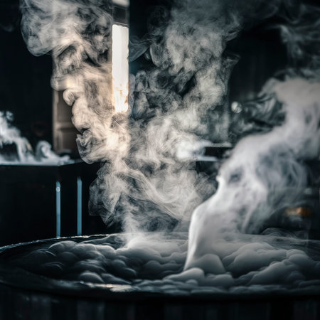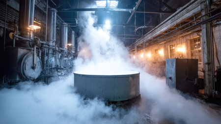 Industrial setting showcasing steam billowing from large equipment in a dimly lit factory. The atmospheric lighting and mist create a dramatic and mysterious scene.