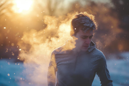 A man holds a vintage camera amidst swirling smoke, creating a mysterious and ethereal atmosphere
