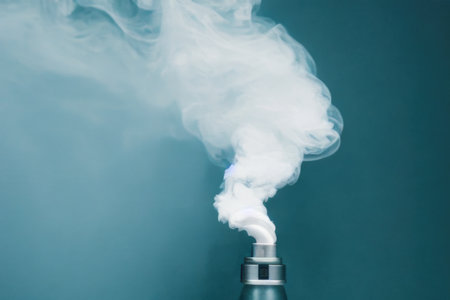 White and gray smoke billowing from an aerosol can against a teal backdrop