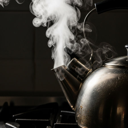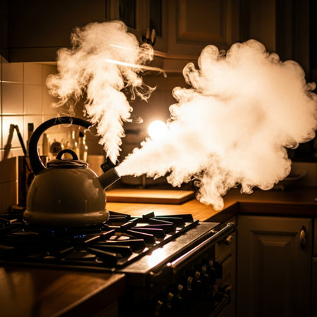 Smoke coming out of a kettle on the stove in the kitchen