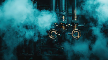 A captivating view of industrial pipes and valves enveloped in blue steam, creating a dramatic atmosphere perfect for themes of technology and manufacturing.