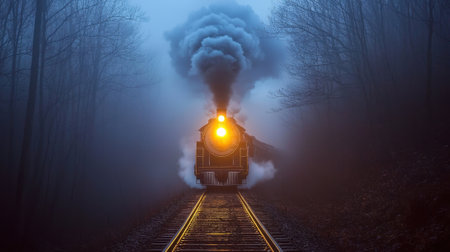 An old steam locomotive emerges from a misty forest, its headlamp cutting through the foggy woodland ambiance.