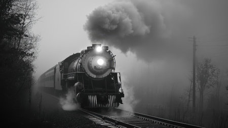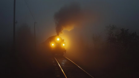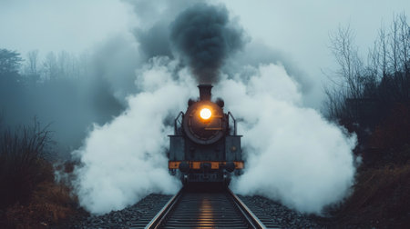 A vintage steam train chugs along the tracks, billowing steam into the misty air. The locomotive's headlight pierces through the fog, creating a haunting yet beautiful sight during dawn.