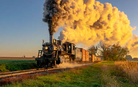 Ronks, Pennsylvania, October 2020 - A View of an Antique Freight Steam Train Blowing Smoke Approaching Thru Trees at Sunrise