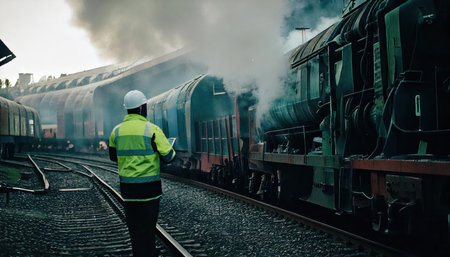 Railway worker in a helmet and reflective vest standing next to the train.