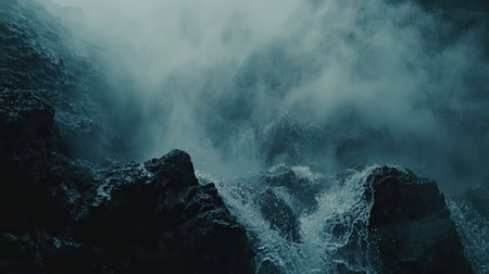 Experience the raw power of nature as waves crash dramatically against rugged rocks in a foggy coastal setting, creating an atmospheric scene.