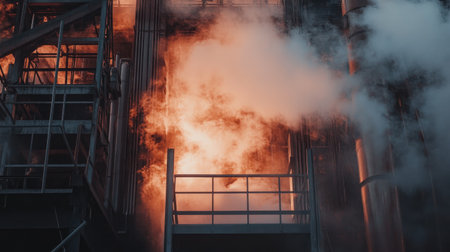 A striking industrial scene showcasing billowing steam and flames erupting from machinery within a power plant, illustrating energy production dynamics.
