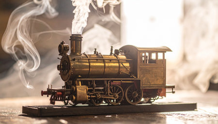 A beautifully crafted miniature steam locomotive, a relic of the industrial age, comes to life with plumes of realistic smoke.