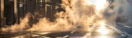 Steam rising from city streets after a heavy rainfall during extreme heat conditions depicting the urban heat and climate change challenges faced by metropolitan areas