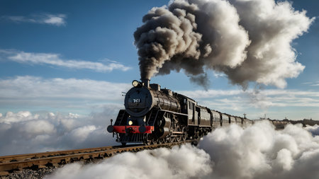 close-up of steam engine with clouds of smoke billowing from its chimney, created with generative ai