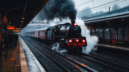 A 19th-century steam engine train station with smoke and iron tracks.