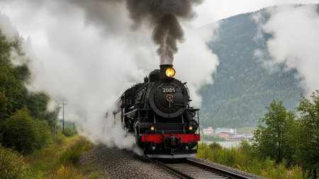 An old black steam train moves along tracks, billowing smoke against a backdrop of mountains and greenery. The scene presents a daytime view, possibly suggesting travel or transportation. This image could be used in various commercial applications, including historical, transportation, and travel-related projects.