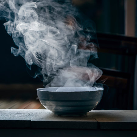 Steaming metal bowl on gray table against dark background