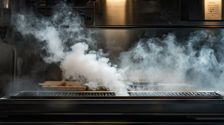 Steam escaping from the exhaust of a cooking grill, with the smoke and steam mingling to create a dynamic and appetizing culinary scene.