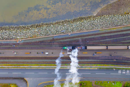 Steam from under the asphalt in winter on a city road in close up. Accident in the sewer.
