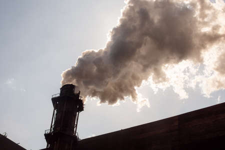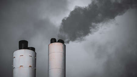 Smoke from an old ugly chimney set against a grey sky