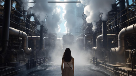 A woman in front of a factory emitting smoke