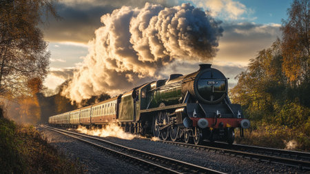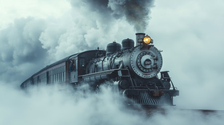 A historic steam locomotive chugs along tracks shrouded in thick fog during autumn. The powerful engine emits clouds of steam, creating a mystical atmosphere in the countryside.