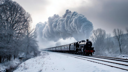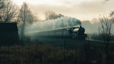 A vintage steam train chugs through a misty landscape at dawn, surrounded by bare trees and soft fog, evoking a sense of nostalgia and adventure in a serene environment.