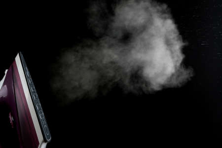 Lilac iron releases steam on a black background. ironing clothes. household electrical appliances.