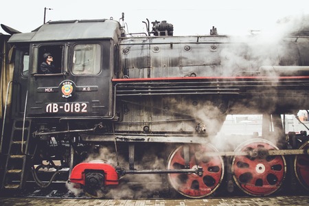 Moscow, Russia - April 04, 2015: The driver in the cab of old locomotive. Retro