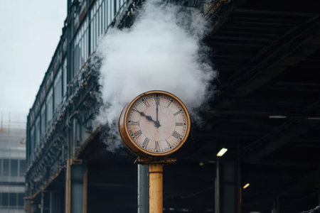 A large clock stands still, indicating a significant hour amidst billowing steam in a vibrant city setting. The surrounding architecture hints at industrial history and urban life.