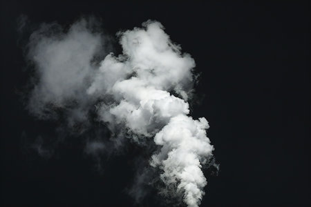 Voluminous white smoke rises and swirls in a dark setting creating an ethereal and captivating visual effect perfect for dramatic atmospheres.