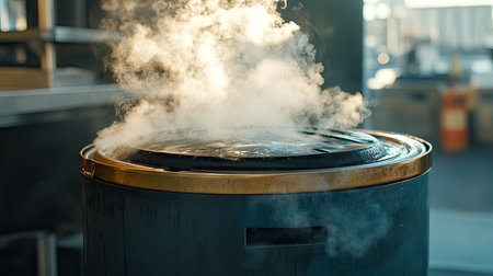 A cooking pot emits steam in an industrial kitchen setting, showcasing the culinary process and atmosphere. The warm lighting adds depth and texture.