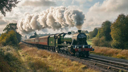 A vintage steam train travels through a picturesque landscape, surrounded by rolling hills and fluffy clouds at sunset, evoking nostalgia and adventure.