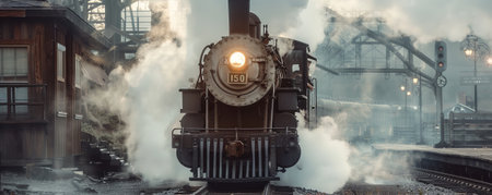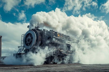 A dramatic shot of steam billowing out of a train locomotive, with the powerful engine and vintage design adding to the historical and industrial ambiance.