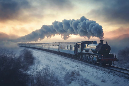 A vintage steam locomotive moves along a snowy track under a vivid sunset sky, releasing thick smoke.