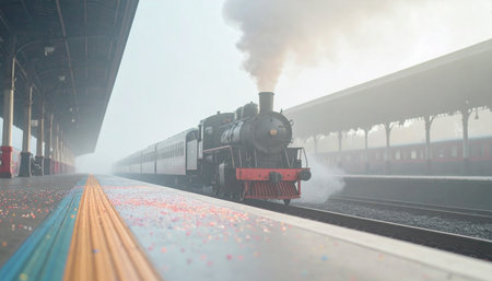 A classic steam train, shrouded in mist, creating a dramatic and nostalgic visual.