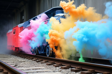 1940s railway platform empty except for scattered rainbow confetti, steam locomotive ready to depart, moody fog, depth for motion blur effect.