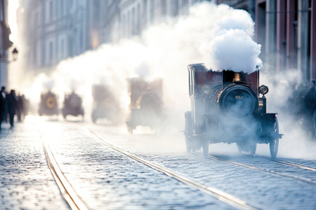 A lively parade winds through a cobblestone street, showcasing brass engines that puff vibrant steam clouds.
