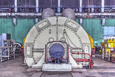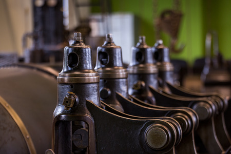 Old fashioned machinery in an old factory interior. Industrial engines. Pipes, gears and valves and other parts.