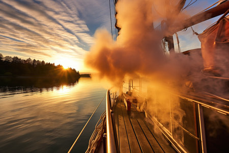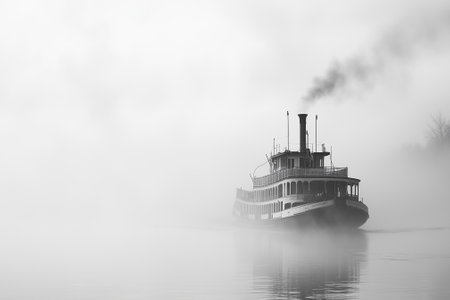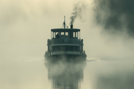 A captivating and picturesque scene of a majestic steamboat gracefully navigating through a foggy river landscape. Generative AI