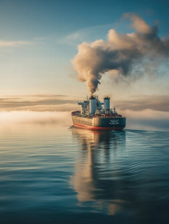 A large oil tanker operates peacefully on the calm sea, with smoke billowing from its chimneys against a serene backdrop.
