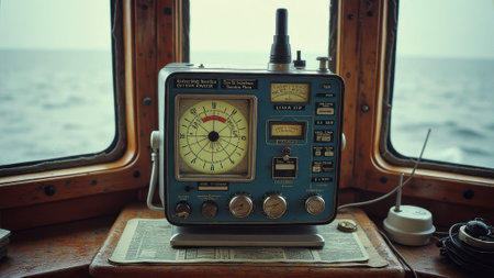 Vintage nautical radio equipment on wooden ship deck with ocean view.