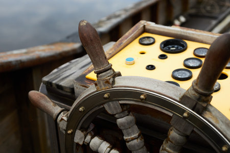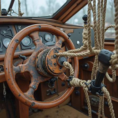 Vintage boat interior shows a weathered wooden steering wheel and thick ropes evoking a sense of nautical history and adventure Perfect for backgrounds or travel themes.