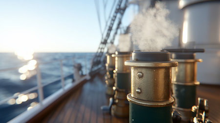 Vintage maritime equipment on ship deck with ocean view. That the image is generated using AI.