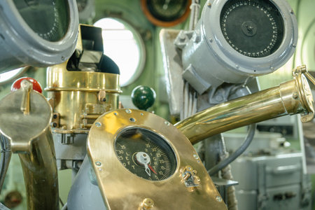 Close-up of antique ship steering equipment, including a polished brass compass and navigation dials. The instruments are housed inside a historical vessels control room.