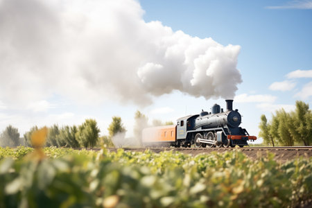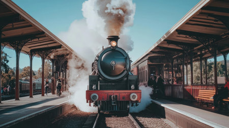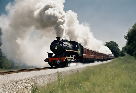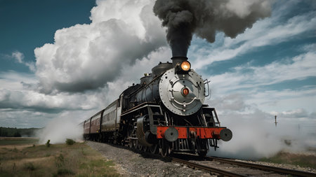 Enigmatic clouds of steam billow from an old-fashioned locomotive, evoking a sense of nostalgia