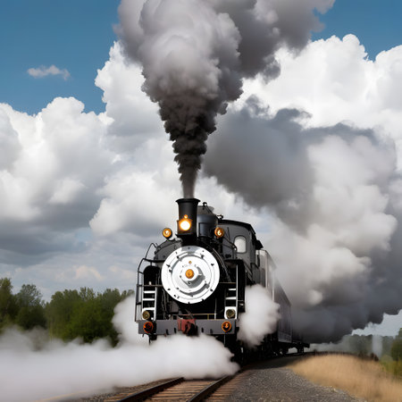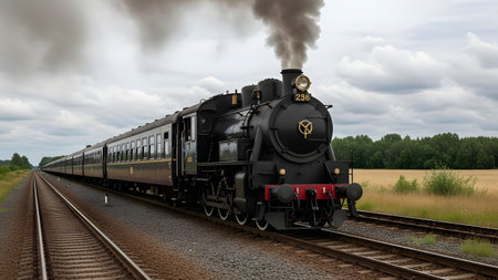 A vintage black steam train chugging along railway tracks through a rural landscape. Thick grey smoke billows from the locomotive's chimney against a cloudy sky, evoking a sense of historical travel.