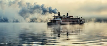 A large steamboat with passengers on board cuts through a thick layer of morning fog on a calm lake. The steam from the boat's engine blends with the fog, creating a dreamy, atmospheric scene.