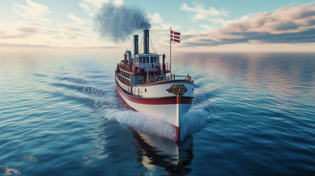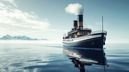Picturesque scene of a majestic steamboat gracefully navigating through a foggy river landscape. Generative AI
