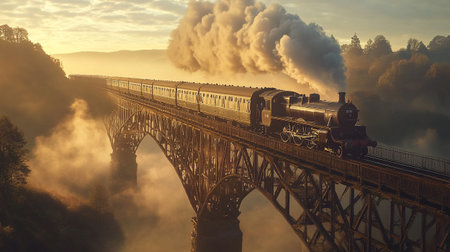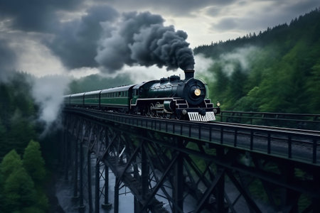 Crossing a towering bridge over a rushing river a historic steam train making its way through a scenic landscape