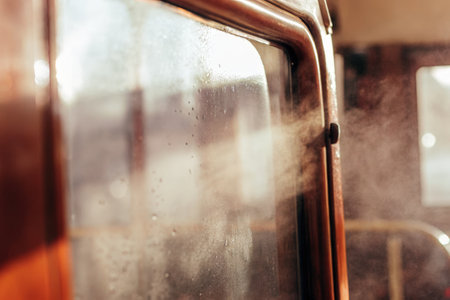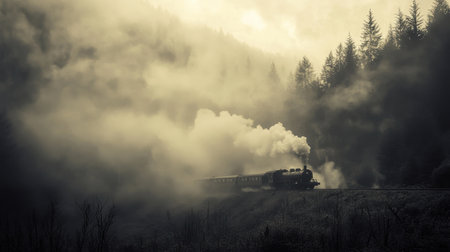 A steam locomotive chugs along a dimly lit track, enveloped in thick fog. The sound of the engine echoes in the stillness, adding to the nostalgic atmosphere of early morning travel.