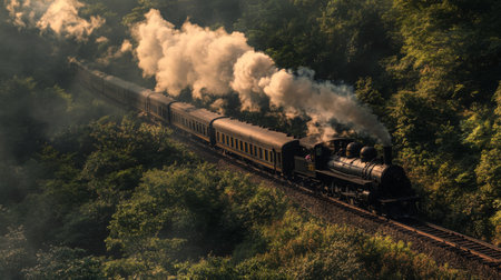 A steam train makes its way along a winding track, billowing smoke as it travels through a lush, dense forest. The surrounding trees create a vibrant backdrop, showing nature's beauty.