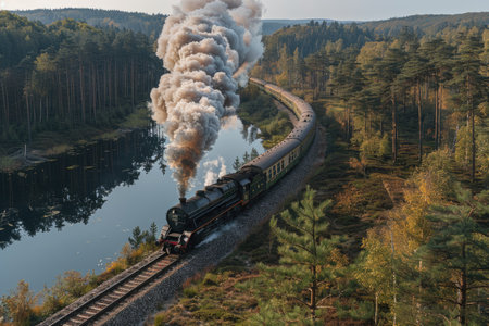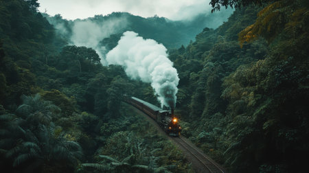 Steam locomotive speeds through mountainous forest landscape generated by artificial intelligence